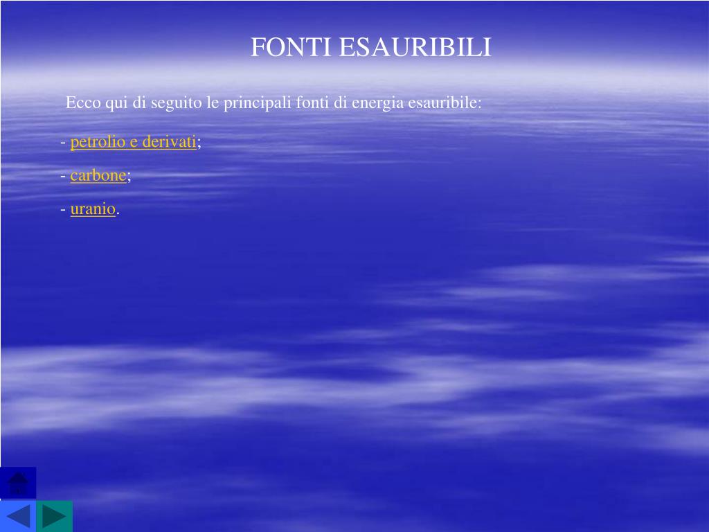 FONTI ESAURIBILI Ecco qui di seguito le principali fonti di energia esauribile: - petrolio e derivati; - carbone; - uranio.