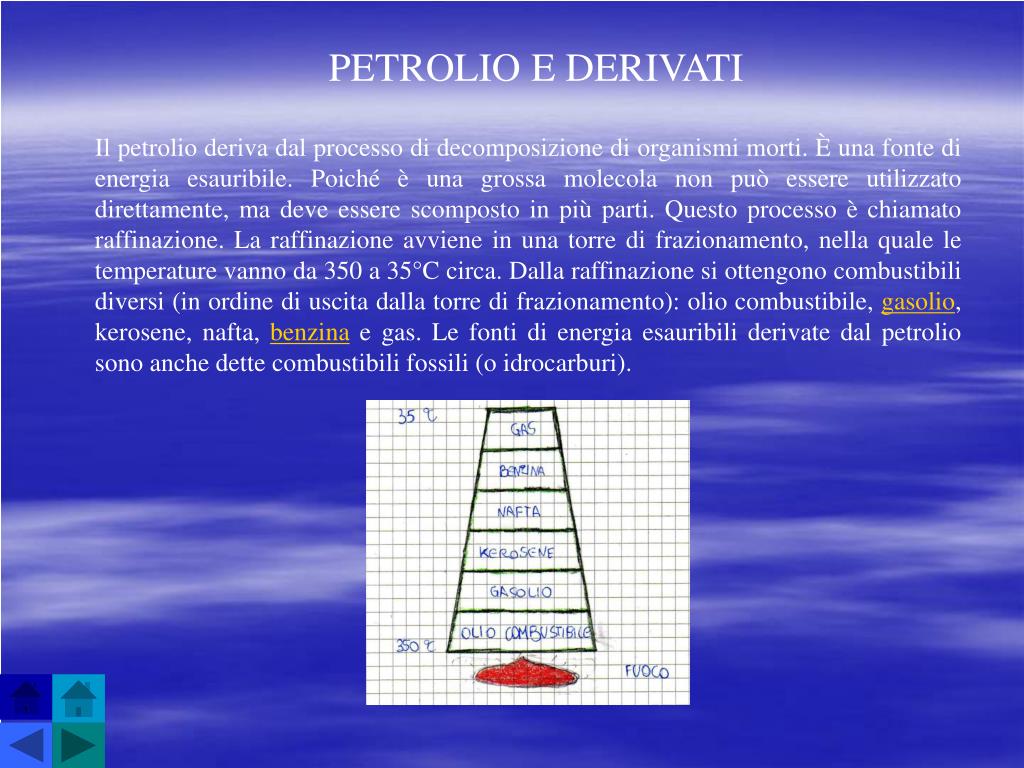 PETROLIO E DERIVATI Il petrolio deriva dal processo di decomposizione di organismi morti. È una fonte di energia esauribile. Poiché è una grossa molecola non può essere utilizzato direttamente, ma deve essere scomposto in più parti. Questo processo è chiamato raffinazione. La raffinazione avviene in una torre di frazionamento, nella quale le temperature vanno da 350 a 35°C circa. Dalla raffinazione si ottengono combustibili diversi (in ordine di uscita dalla torre di frazionamento): olio combustibile, gasolio, kerosene, nafta, benzina e gas. Le fonti di energia esauribili derivate dal petrolio sono anche dette combustibili fossili (o idrocarburi).