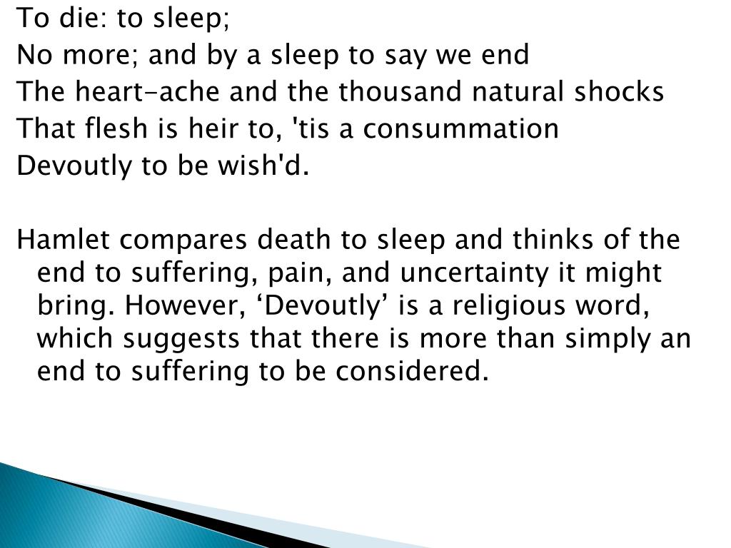 To die: to sleep; No more; and by a sleep to say we end The heart-ache and the thousand natural shocks That flesh is heir to, 'tis a consummation Devoutly to be wish'd. Hamlet compares death to sleep and thinks of the end to suffering, pain, and uncertainty it might bring. However, ‘Devoutly’ is a religious word, which suggests that there is more than simply an end to suffering to be considered.