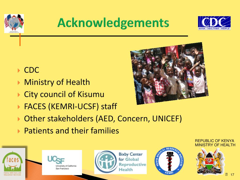 Acknowledgements • CDC • Ministry of Health • City council of Kisumu • FACES (KEMRI-UCSF) staff • Other stakeholders (AED, Concern, UNICEF) • Patients and their families