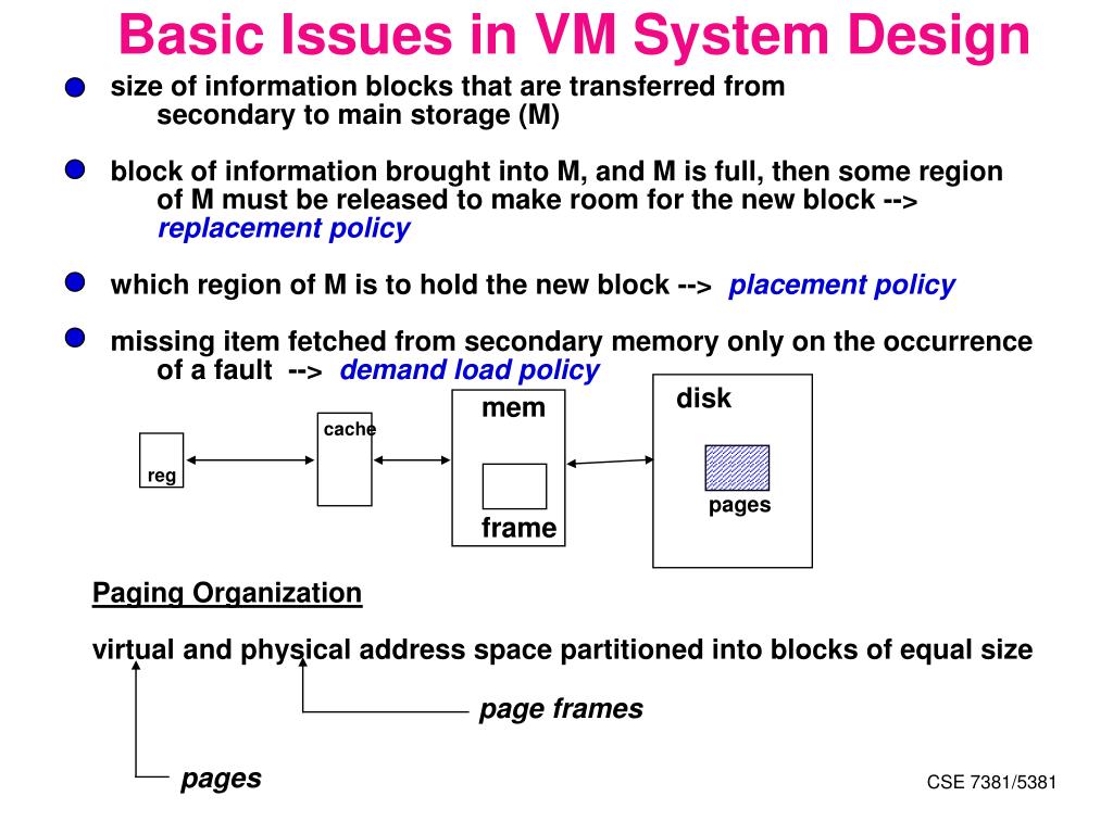 size of information blocks that are transferred from secondary to main storage (M) block of information brought into M, and M is full, then some region of M must be released to make room for the new block --> replacement policy which region of M is to hold the new block --> placement policy missing item fetched from secondary memory only on the occurrence of a fault --> demand load policy Basic Issues in VM System Design disk mem cache reg pages frame Paging Organization virtual and physical address space partitioned into blocks of equal size page frames pages