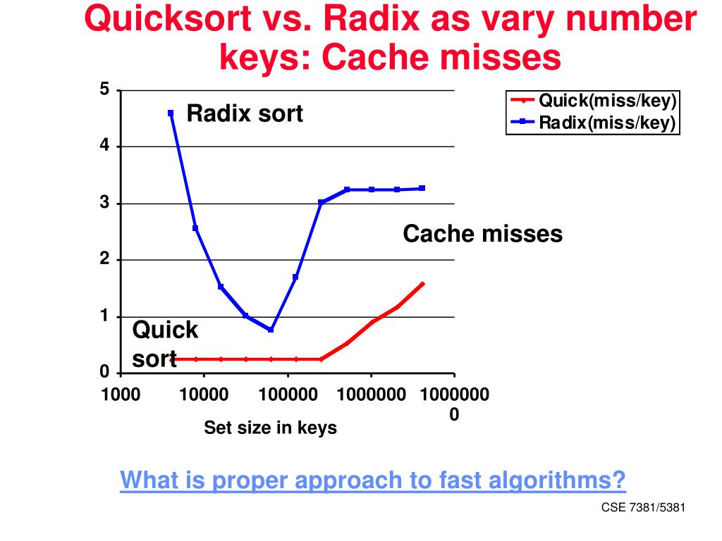 Quicksort vs. Radix as vary number keys: Cache misses Radix sort Cache misses Quick sort Set size in keys What is proper approach to fast algorithms?