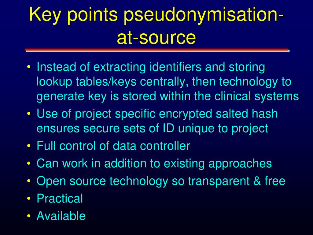 So key question is • Why not pseudonymise-at-source when technology available and its better for patient confidentiality?