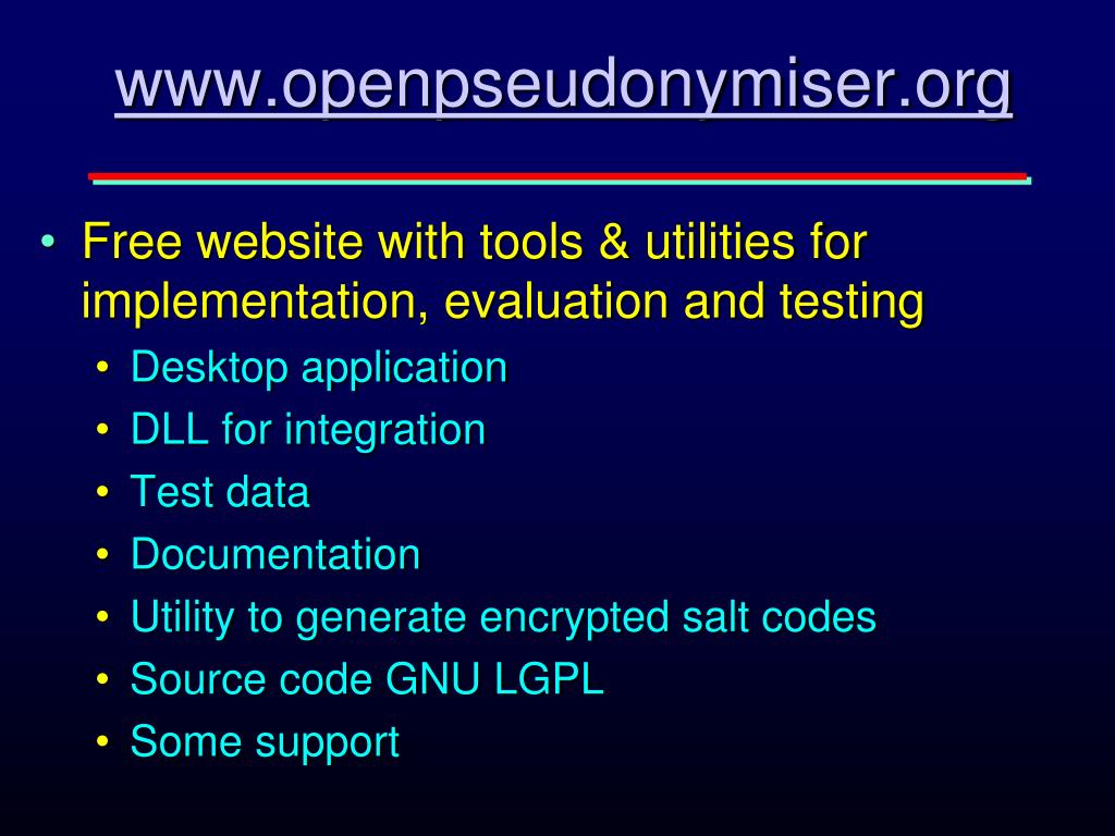 www.openpseudonymiser.org • Free website with tools & utilities for implementation, evaluation and testing • Desktop application • DLL for integration • Test data • Documentation • Utility to generate encrypted salt codes • Source code GNU LGPL • Some support