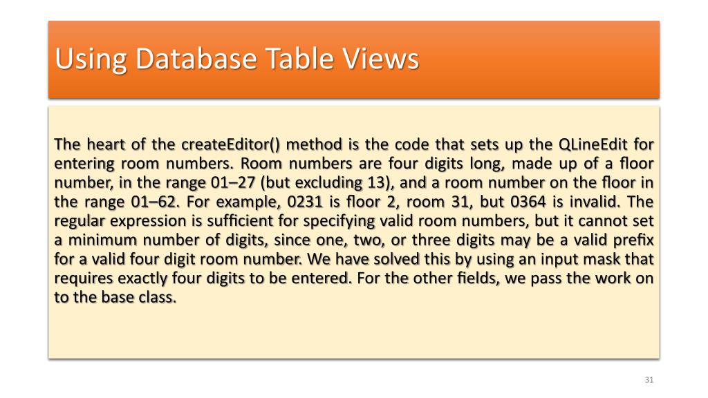 Using Database Table Views The heart of the createEditor() method is the code that sets up the QLineEdit for entering room numbers. Room numbers are four digits long, made up of a floor number, in the range 01–27 (but excluding 13), and a room number on the floor in the range 01–62. For example, 0231 is floor 2, room 31, but 0364 is invalid. The regular expression is sufficient for specifying valid room numbers, but it cannot set a minimum number of digits, since one, two, or three digits may be a valid prefix for a valid four digit room number. We have solved this by using an input mask that requires exactly four digits to be entered. For the other fields, we pass the work on to the base class.