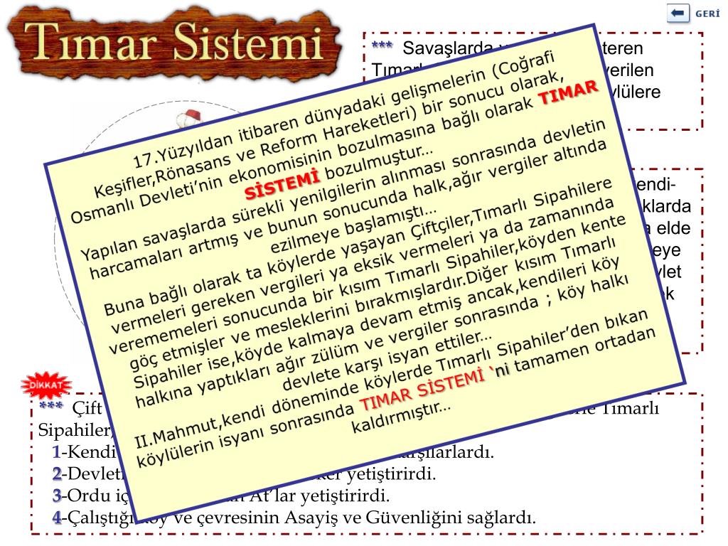*** Savaşlarda yararlılık gösteren Tımarlı Sipahiler,kendilerine verilen arazileri o yörede yaşayan köylülere kullanım hakkını verirlerdi. *** Tımarlı Sipahiler tarafından kendi-lerine kullanım hakkı verilen topraklarda istediklerini eken “Çift” yıl sonunda elde ettiği gelirin % 10 ‘nu devletin o yöreye gönderdiği Mültezim adı verilen devlet memurları aracılığı ile arazinin gerçek sahibi olan Tımarlı Sipahiler ’e ulaştırırdı. *** Çift ‘lerden kendilerine Mültezimler aracılığı ile ulaşan vergilerle Tımarlı Sipahiler;1-Kendi geçimlerini devlete yük olmadan karşılarlardı.2-Devletin Askeri Birimleri’ne asker yetiştirirdi.3-Ordu için gerekli olan At’lar yetiştirirdi.4-Çalıştığı köy ve çevresinin Asayiş ve Güvenliğini sağlardı.