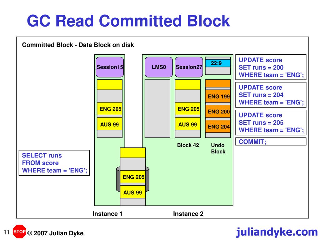 UPDATE score SET runs = 200WHERE team = 'ENG'; 22:10 22:9 Session27 Session15 LMS0 ENG 200 ENG 199 UPDATE score SET runs = 204WHERE team = 'ENG'; ENG 204 ENG 200 ENG 205 ENG 199 ENG 199 ENG 205 ENG 205 ENG 205 UPDATE score SET runs = 205WHERE team = 'ENG'; ENG 204 AUS 99 AUS 99 AUS 99 AUS 99 AUS 99 COMMIT; SELECT runs FROM score WHERE team = 'ENG'; STOP GC Read Committed Block Committed Block - Data Block on disk Block 42 UndoBlock Instance 1 Instance 2