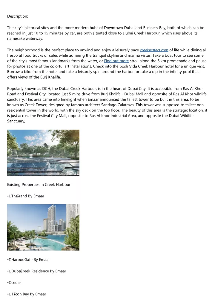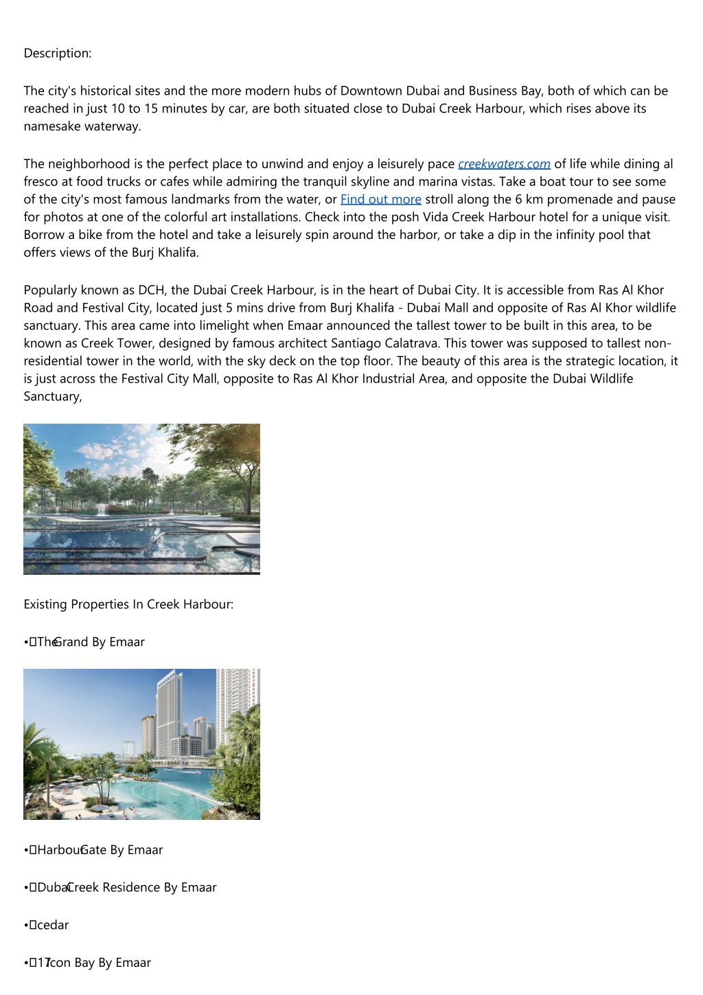 Description: The city's historical sites and the more modern hubs of Downtown Dubai and Business Bay, both of which can be reached in just 10 to 15 minutes by car, are both situated close to Dubai Creek Harbour, which rises above its namesake waterway. The neighborhood is the perfect place to unwind and enjoy a leisurely pace creekwaters.com of life while dining al fresco at food trucks or cafes while admiring the tranquil skyline and marina vistas. Take a boat tour to see some of the city's most famous landmarks from the water, or Find out more stroll along the 6 km promenade and pause for photos at one of the colorful art installations. Check into the posh Vida Creek Harbour hotel for a unique visit. Borrow a bike from the hotel and take a leisurely spin around the harbor, or take a dip in the infinity pool that offers views of the Burj Khalifa. Popularly known as DCH, the Dubai Creek Harbour, is in the heart of Dubai City. It is accessible from Ras Al Khor Road and Festival City, located just 5 mins drive from Burj Khalifa - Dubai Mall and opposite of Ras Al Khor wildlife sanctuary. This area came into limelight when Emaar announced the tallest tower to be built in this area, to be known as Creek Tower, designed by famous architect Santiago Calatrava. This tower was supposed to tallest non- residential tower in the world, with the sky deck on the top floor. The beauty of this area is the strategic location, it is just across the Festival City Mall, opposite to Ras Al Khor Industrial Area, and opposite the Dubai Wildlife Sanctuary, Existing Properties In Creek Harbour: • The Grand By Emaar • Harbour Gate By Emaar • Dubai Creek Residence By Emaar • cedar • 17 Icon Bay By Emaar