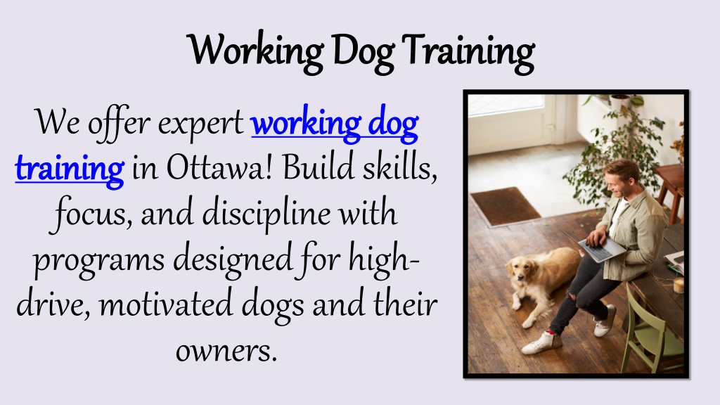 Working Dog Training We offer expert working dog training in Ottawa! Build skills, focus, and discipline with programs designed for high-drive, motivated dogs and their owners.