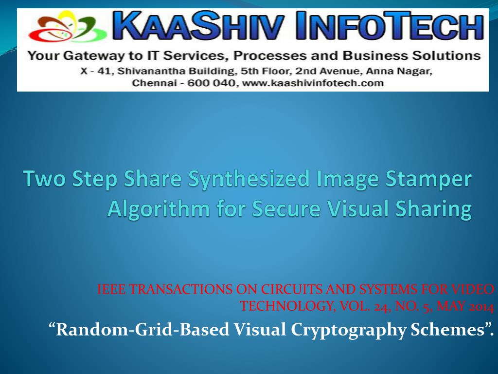 Two Step Share Synthesized Image Stamper Algorithm for Secure Visual Sharing IEEE TRANSACTIONS ON CIRCUITS AND SYSTEMS FOR VIDEO TECHNOLOGY, VOL. 24, NO. 5, MAY 2014 “Random-Grid-Based Visual Cryptography Schemes”.