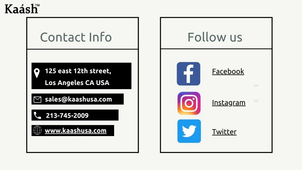 Contact Info Follow us 125 east 12th street, Facebook Los Angeles CA USA sales@kaashusa.com Instagram 213-745-2009 www.kaashusa.com Twitter