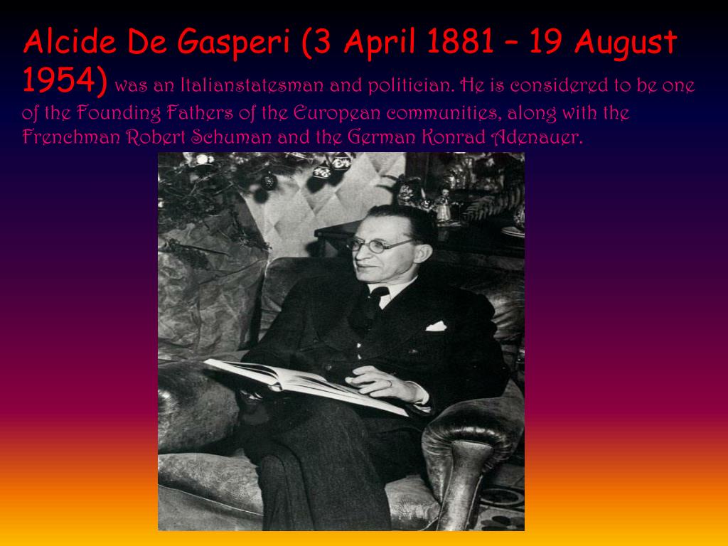 Alcide De Gasperi (3 April 1881 – 19 August 1954)was an Italianstatesman and politician. He is considered to be one of the Founding Fathers of the European communities, along with the Frenchman Robert Schuman and the German Konrad Adenauer.