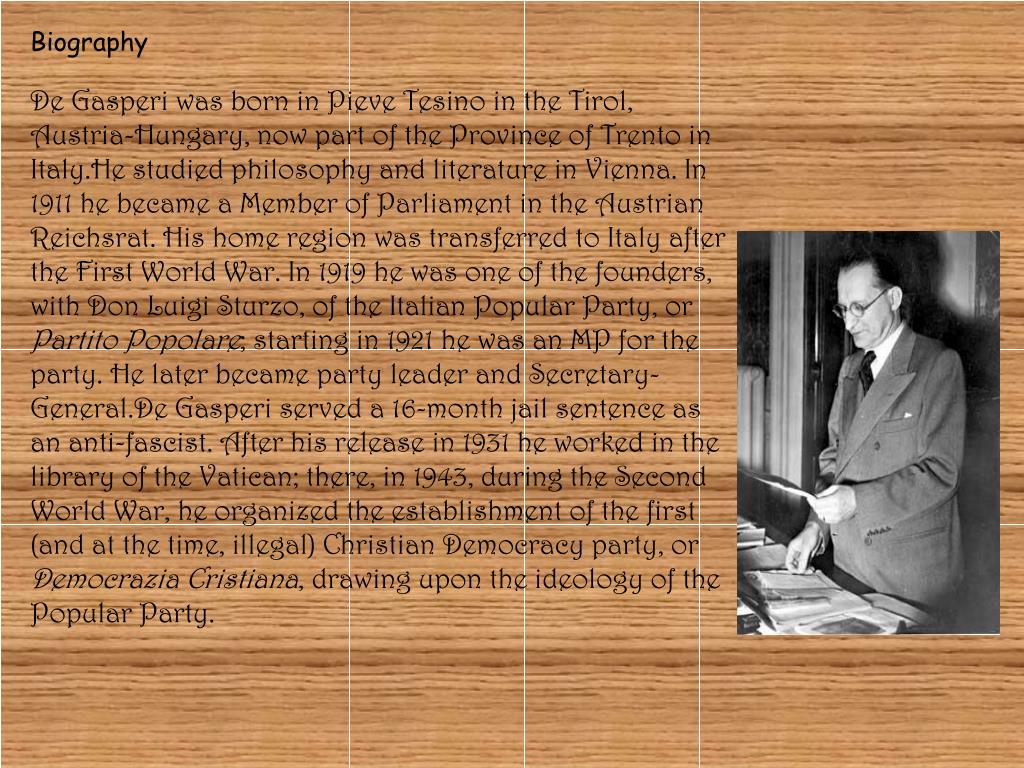 Biography De Gasperi was born in Pieve Tesino in the Tirol, Austria-Hungary, now part of the Province of Trento in Italy.He studied philosophy and literature in Vienna. In 1911 he became a Member of Parliament in the Austrian Reichsrat. His home region was transferred to Italy after the First World War. In 1919 he was one of the founders, with Don Luigi Sturzo, of the Italian Popular Party, or Partito Popolare; starting in 1921 he was an MP for the party. He later became party leader and Secretary-General.De Gasperi served a 16-month jail sentence as an anti-fascist. After his release in 1931 he worked in the library of the Vatican; there, in 1943, during the Second World War, he organized the establishment of the first (and at the time, illegal) Christian Democracy party, or Democrazia Cristiana, drawing upon the ideology of the Popular Party.