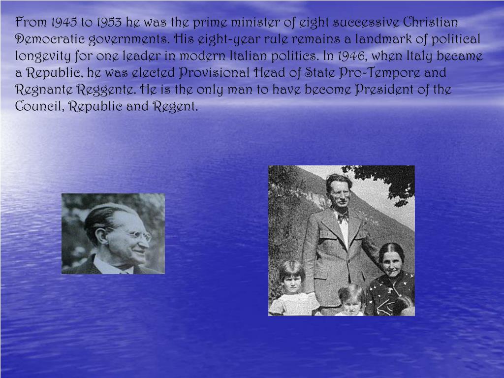From 1945 to 1953 he was the prime minister of eight successive Christian Democratic governments. His eight-year rule remains a landmark of political longevity for one leader in modern Italian politics. In 1946, when Italy became a Republic, he was elected Provisional Head of State Pro-Tempore and Regnante Reggente. He is the only man to have become President of the Council, Republic and Regent.