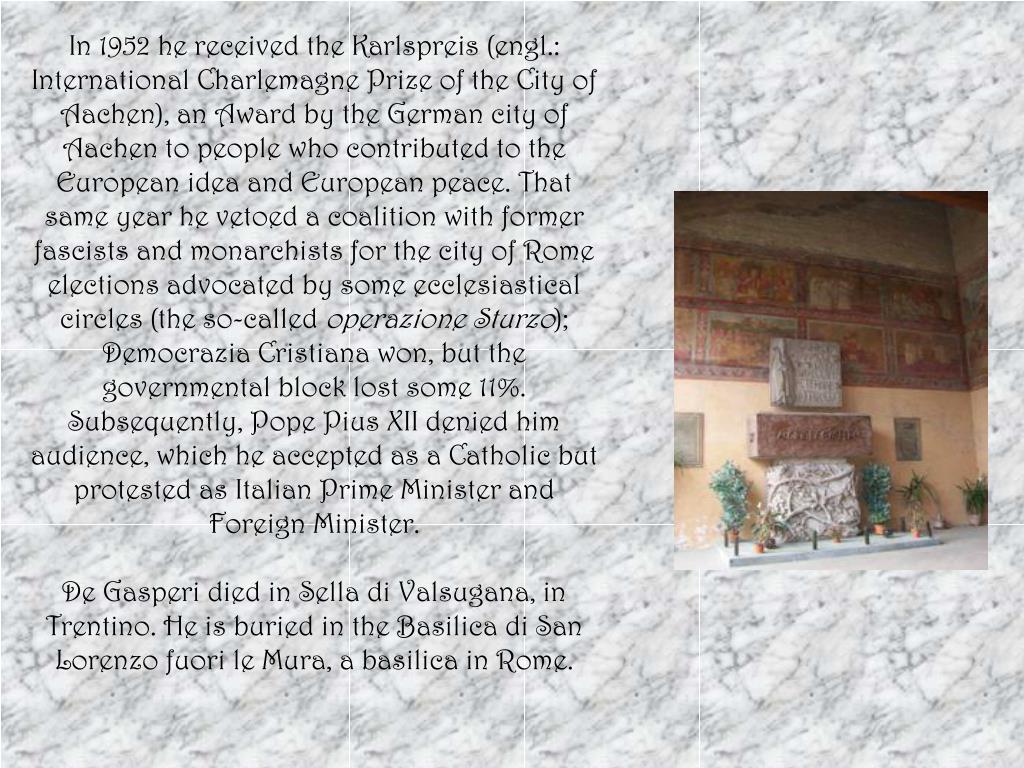 In 1952 he received the Karlspreis (engl.: International Charlemagne Prize of the City of Aachen), an Award by the German city of Aachen to people who contributed to the European idea and European peace. That same year he vetoed a coalition with former fascists and monarchists for the city of Rome elections advocated by some ecclesiastical circles (the so-called operazione Sturzo); Democrazia Cristiana won, but the governmental block lost some 11%. Subsequently, Pope Pius XII denied him audience, which he accepted as a Catholic but protested as Italian Prime Minister and Foreign Minister. De Gasperi died in Sella di Valsugana, in Trentino. He is buried in the Basilica di San Lorenzo fuori le Mura, a basilica in Rome.