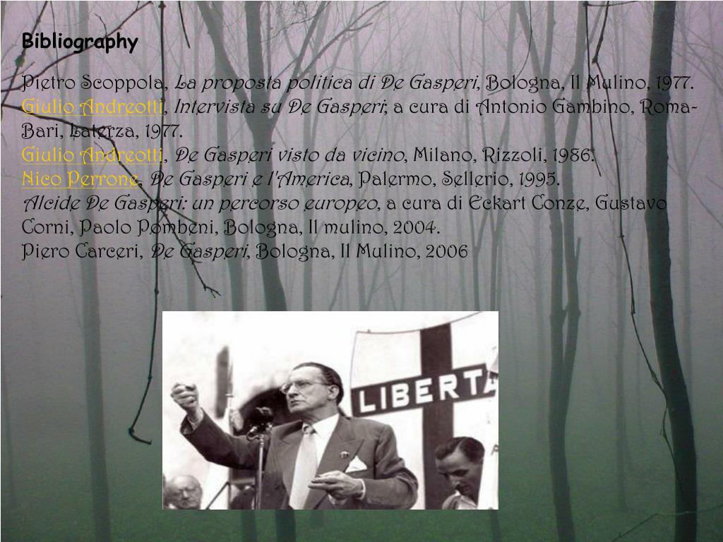 Bibliography Pietro Scoppola, La proposta politica di De Gasperi, Bologna, Il Mulino, 1977. Giulio Andreotti, Intervista su De Gasperi; a cura di Antonio Gambino, Roma-Bari, Laterza, 1977. Giulio Andreotti, De Gasperi visto da vicino, Milano, Rizzoli, 1986. Nico Perrone, De Gasperi e l'America, Palermo, Sellerio, 1995. Alcide De Gasperi: un percorso europeo, a cura di Eckart Conze, Gustavo Corni, Paolo Pombeni, Bologna, Il mulino, 2004. Piero Carceri, De Gasperi, Bologna, Il Mulino, 2006