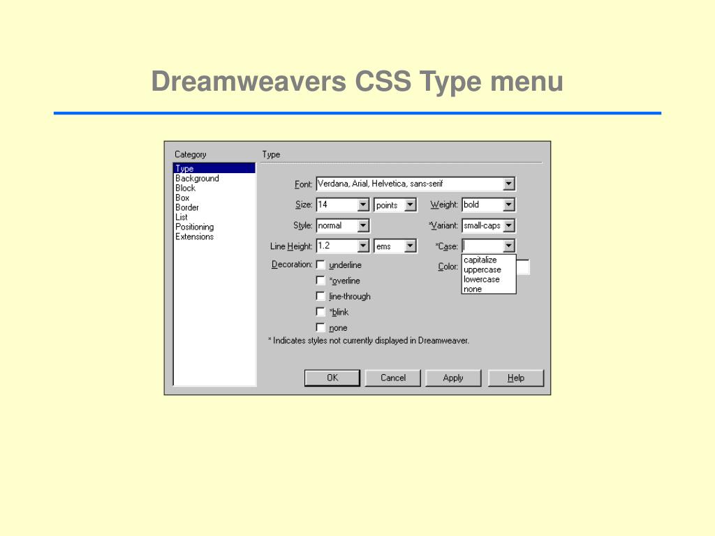 Font substitution Font substitution i Dreamweavers tekstmenu med tilhørende html-kode for to grundtyper