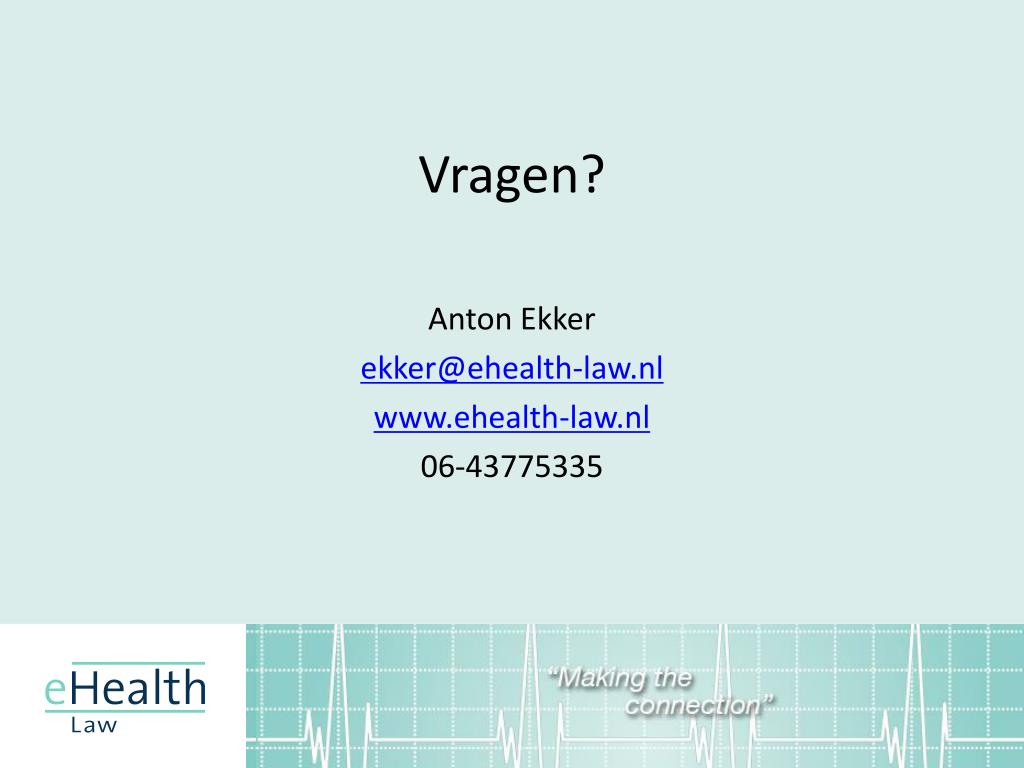 Vragen? Anton Ekker ekker@ehealth-law.nl www.ehealth-law.nl 06-43775335