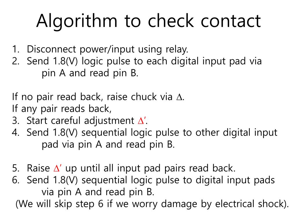 Algorithm to check contact Disconnect power/input using relay. Send 1.8(V) logicpulse to each digital input pad via pin A and read pin B. If no pair read back, raise chuck via . If any pair reads back, 3. Start careful adjustment ’. 4. Send 1.8(V) sequential logic pulse to other digital input pad via pin A and read pin B. Raise ’ up until all input pad pairs read back. Send 1.8(V) sequential logic pulse to digital input pads via pin A and read pin B. (We will skip step 6 if we worry damage by electrical shock).