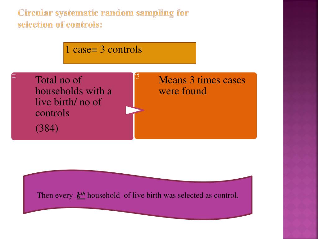Circular systematic random sampling for selection of controls: 1 case= 3 controls Then every kthhousehold of live birth was selected as control.
