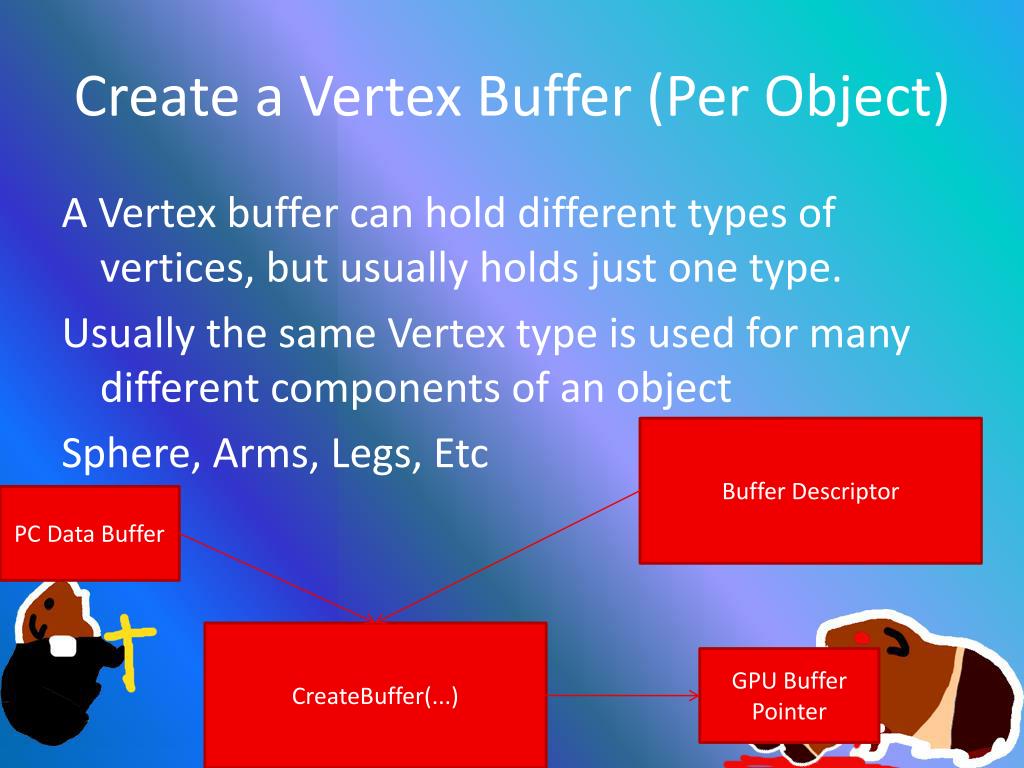 Create a Vertex Buffer (Per Object) A Vertex buffer can hold different types of vertices, but usually holds just one type. Usually the same Vertex type is used for many different components of an object Sphere, Arms, Legs, Etc Buffer Descriptor PC Data Buffer CreateBuffer(...) GPU Buffer Pointer