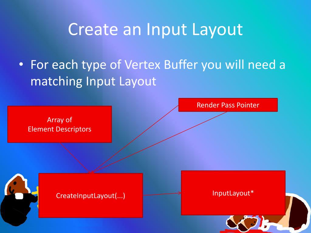 Create an Input Layout • For each type of Vertex Buffer you will need a matching Input Layout Render Pass Pointer Array of Element Descriptors InputLayout* CreateInputLayout(...)