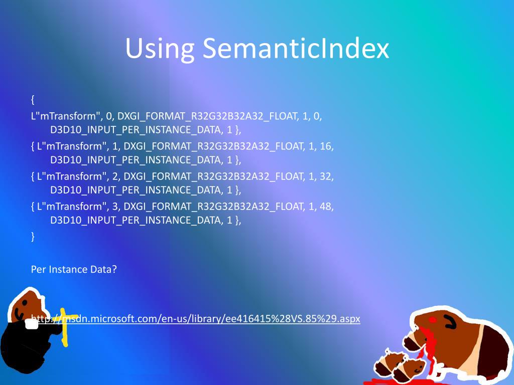 Using SemanticIndex { L"mTransform", 0, DXGI_FORMAT_R32G32B32A32_FLOAT, 1, 0, D3D10_INPUT_PER_INSTANCE_DATA, 1 }, { L"mTransform", 1, DXGI_FORMAT_R32G32B32A32_FLOAT, 1, 16, D3D10_INPUT_PER_INSTANCE_DATA, 1 }, { L"mTransform", 2, DXGI_FORMAT_R32G32B32A32_FLOAT, 1, 32, D3D10_INPUT_PER_INSTANCE_DATA, 1 }, { L"mTransform", 3, DXGI_FORMAT_R32G32B32A32_FLOAT, 1, 48, D3D10_INPUT_PER_INSTANCE_DATA, 1 }, } Per Instance Data? http://msdn.microsoft.com/en-us/library/ee416415%28VS.85%29.aspx