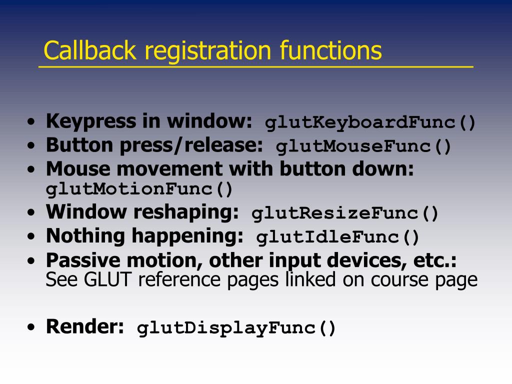 Callback registration functions • Keypress in window: glutKeyboardFunc() • Button press/release: glutMouseFunc() • Mouse movement with button down: glutMotionFunc() • Window reshaping: glutResizeFunc() • Nothing happening: glutIdleFunc() • Passive motion, other input devices, etc.: See GLUT reference pages linked on course page • Render: glutDisplayFunc()