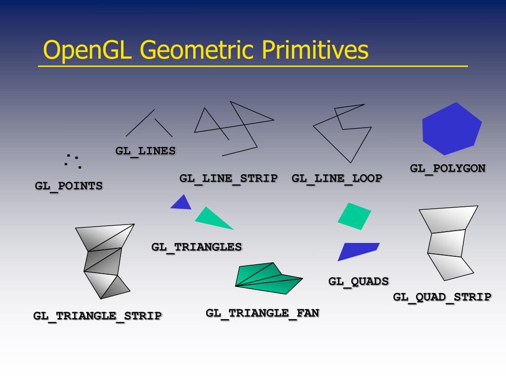 GL_LINES GL_POLYGON GL_LINE_STRIP GL_LINE_LOOP GL_POINTS GL_TRIANGLES GL_QUADS GL_TRIANGLE_FAN GL_TRIANGLE_STRIP GL_QUAD_STRIP OpenGL Geometric Primitives