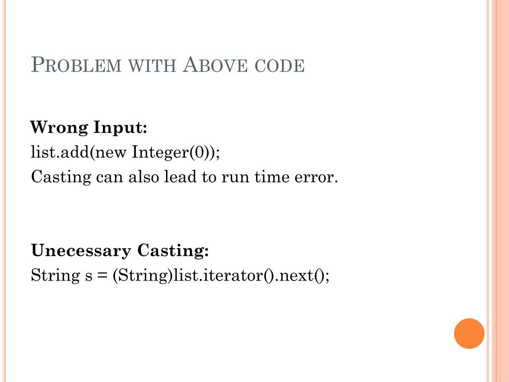 Problem with Above code Wrong Input: list.add(new Integer(0)); Casting can also lead to run time error. Unecessary Casting: String s = (String)list.iterator().next();