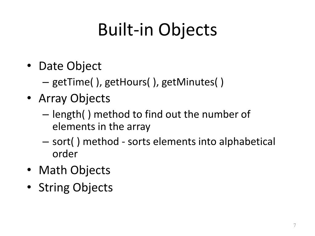 Built-in Objects • Date Object • getTime( ), getHours( ), getMinutes( ) • Array Objects • length( ) method to find out the number of elements in the array • sort( ) method - sorts elements into alphabetical order • Math Objects • String Objects