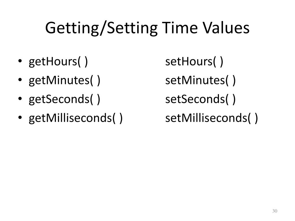 Getting/Setting Time Values • getHours( ) setHours( ) • getMinutes( ) setMinutes( ) • getSeconds( ) setSeconds( ) • getMilliseconds( ) setMilliseconds( )