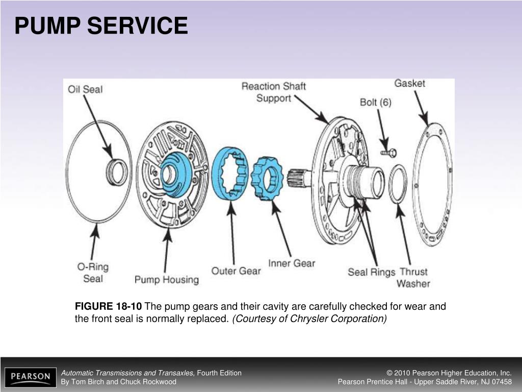 FIGURE 18-10 The pump gears and their cavity are carefully checked for wear and the front seal is normally replaced. (Courtesy of Chrysler Corporation) PUMP SERVICE