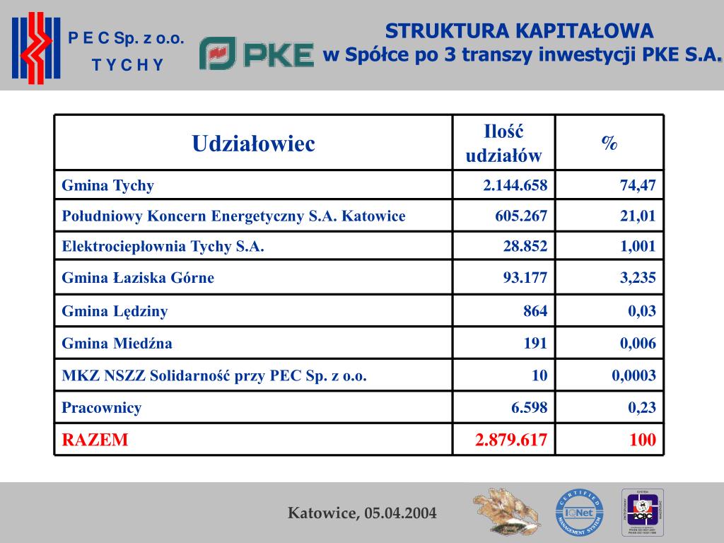 Udziałowiec Ilość udziałów % Gmina Tychy 2.144.658 74,47 Południowy Koncern Energetyczny S.A. Katowice 605.267 21,01 Elektrociepłownia Tychy S.A. 28.852 1,001 Gmina Łaziska Górne 93.177 3,235 Gmina Lędziny 864 0,03 Gmina Miedźna 191 0,006 MKZ NSZZ Solidarność przy PEC Sp. z o.o. 10 0,0003 Katowice, 05.04.2004 Pracownicy 6.598 0,23 RAZEM 2.879.617 100 STRUKTURA KAPITAŁOWA w Spółce po 3 transzy inwestycji PKE S.A. Bielsko-Biała, 12.02.2004