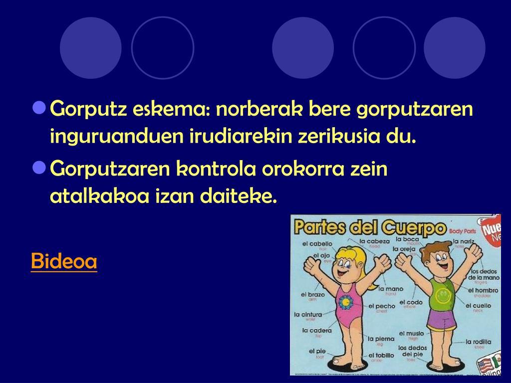 Gorputz eskema: norberak bere gorputzaren inguruanduen irudiarekin zerikusia du. Gorputzaren kontrola orokorra zein atalkakoa izan daiteke. Bideoa