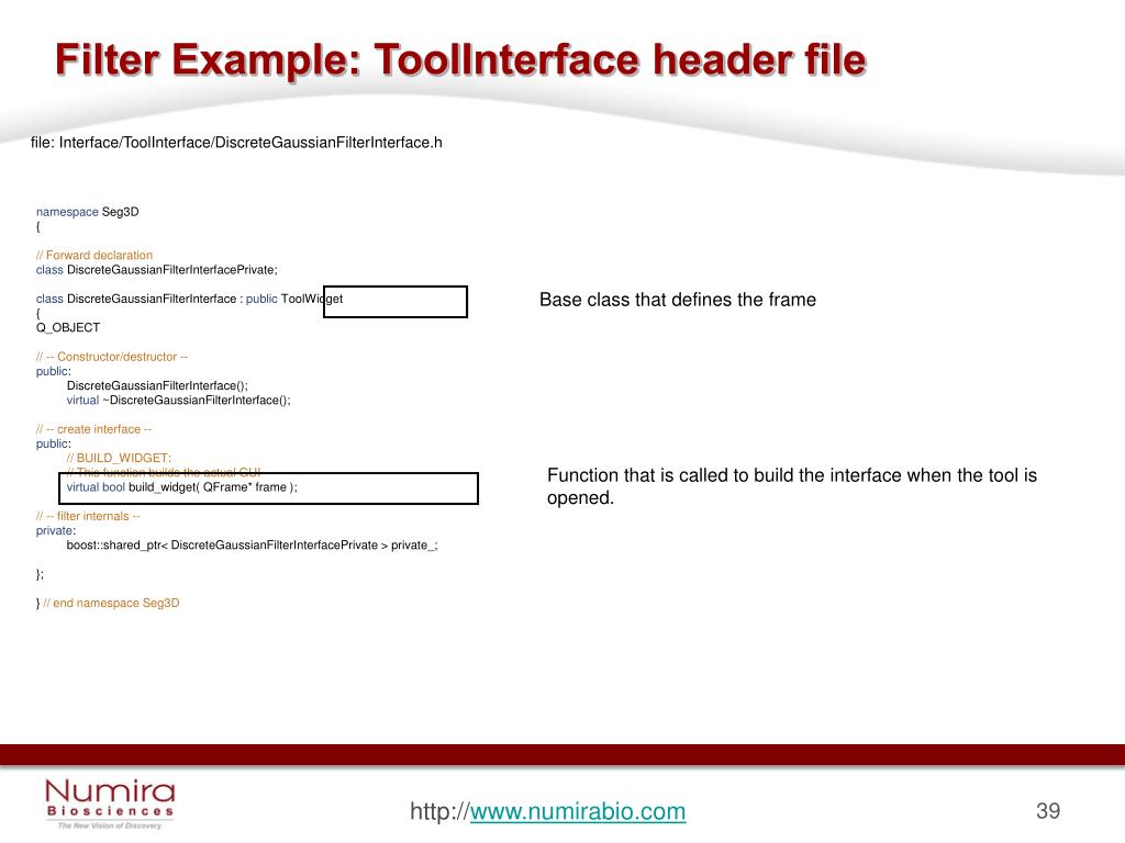 Filter Example: ToolInterface header file file: Interface/ToolInterface/DiscreteGaussianFilterInterface.h namespace Seg3D { // Forward declaration class DiscreteGaussianFilterInterfacePrivate; class DiscreteGaussianFilterInterface : public ToolWidget { Q_OBJECT // -- Constructor/destructor -- public: DiscreteGaussianFilterInterface(); virtual ~DiscreteGaussianFilterInterface(); // -- create interface -- public: // BUILD_WIDGET: // This function builds the actual GUI virtualbool build_widget( QFrame* frame ); // -- filter internals -- private: boost::shared_ptr< DiscreteGaussianFilterInterfacePrivate > private_; }; } // end namespace Seg3D Base class that defines the frame Function that is called to build the interface when the tool is opened. http://www.numirabio.com
