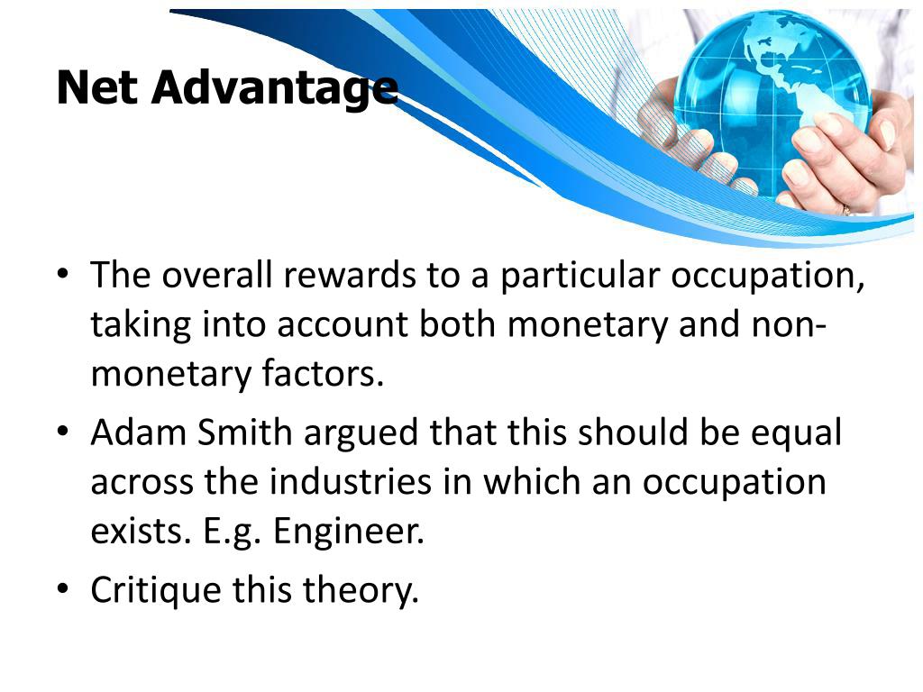 Net Advantage • The overall rewards to a particular occupation, taking into account both monetary and non-monetary factors. • Adam Smith argued that this should be equal across the industries in which an occupation exists. E.g. Engineer. • Critique this theory.