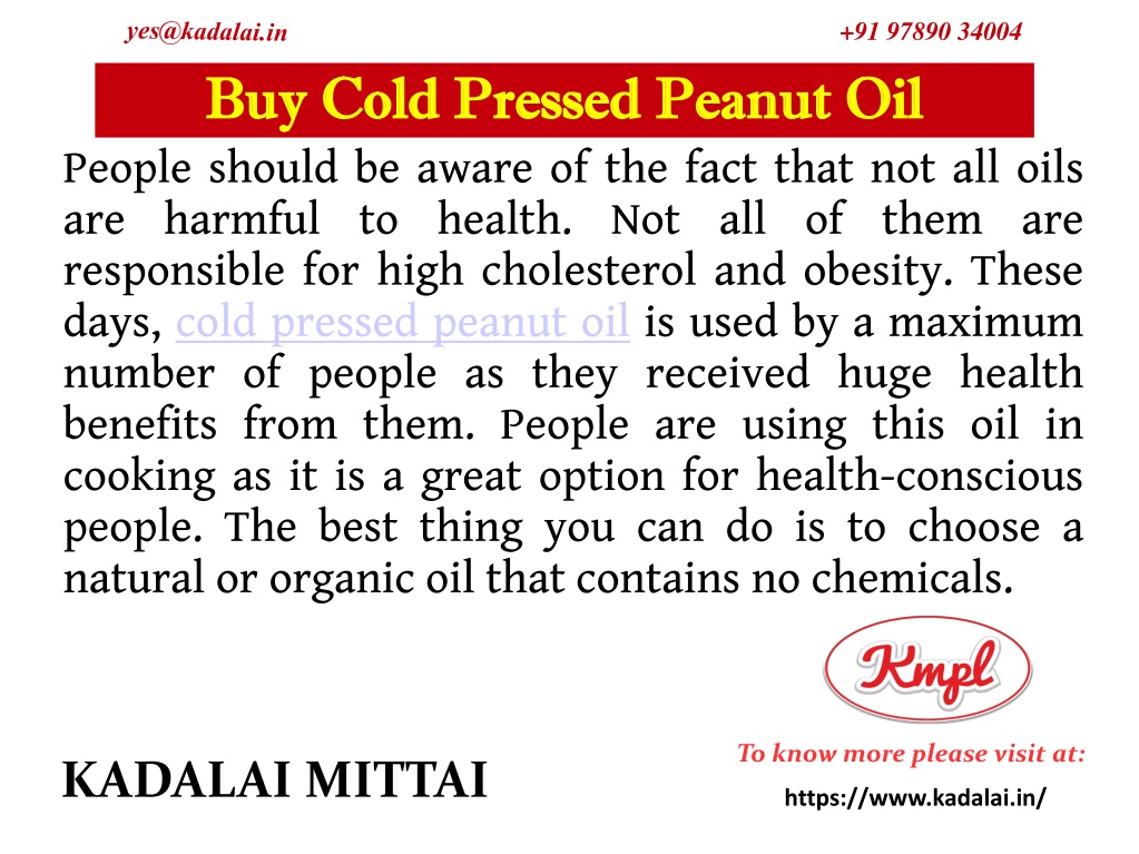 yes@kadalai.in +91 97890 34004 Buy Cold Pressed Peanut Oil To know more please visit at: KADALAI MITTAI https://www.kadalai.in/