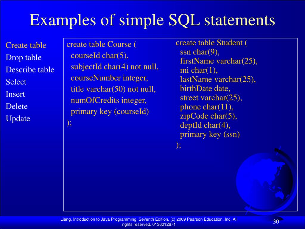 Examples of simple SQL statements create table Course ( courseId char(5), subjectId char(4) not null, courseNumber integer, title varchar(50) not null, numOfCredits integer, primary key (courseId) ); create table Student ( ssn char(9), firstName varchar(25), mi char(1), lastName varchar(25), birthDate date, street varchar(25), phone char(11), zipCode char(5), deptId char(4), primary key (ssn) ); Create table Drop table Describe table Select Insert Delete Update