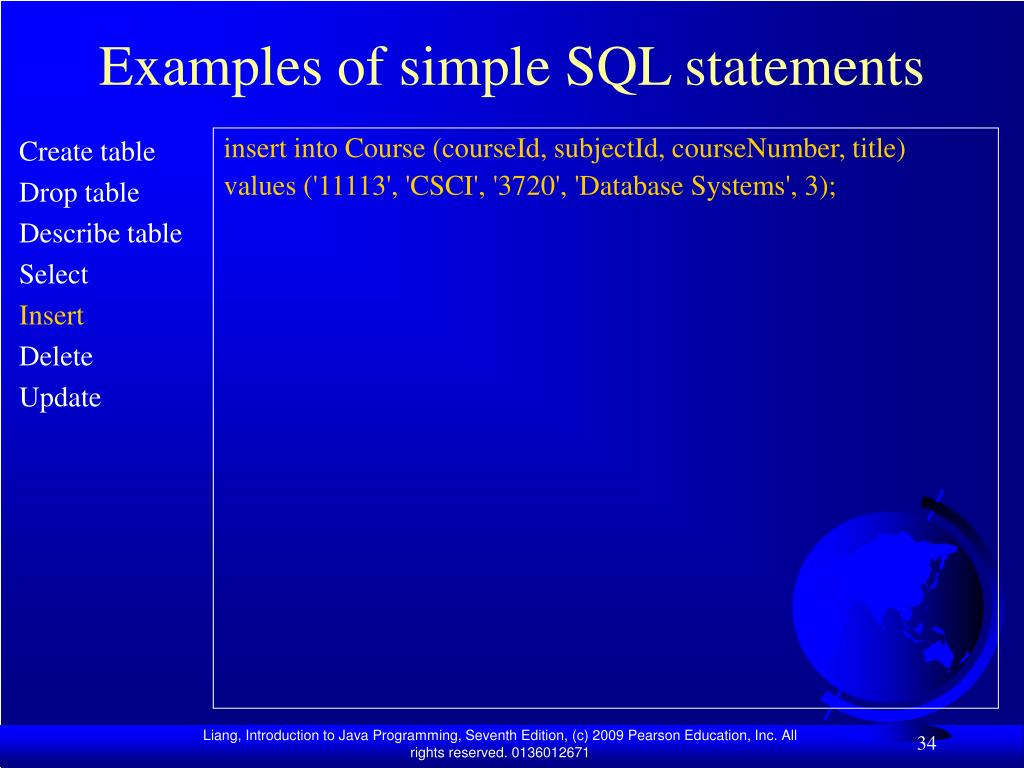Examples of simple SQL statements insert into Course (courseId, subjectId, courseNumber, title) values ('11113', 'CSCI', '3720', 'Database Systems', 3); Create table Drop table Describe table Select Insert Delete Update