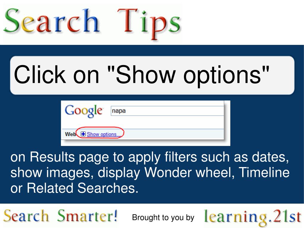 Click on "Show options" on Results page to apply filters such as dates, show images, display Wonder wheel, Timeline or Related Searches. Brought to you by