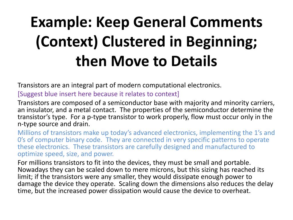 Example: Keep General Comments (Context) Clustered in Beginning; then Move to Details Transistors are an integral part of modern computational electronics. [Suggest blue insert here because it relates to context] Transistors are composed of a semiconductor base with majority and minority carriers, an insulator, and a metal contact. The properties of the semiconductor determine the transistor’s type. For a p-type transistor to work properly, flow must occur only in the n-type source and drain. Millions of transistors make up today’s advanced electronics, implementing the 1’s and 0’s of computer binary code. They are connected in very specific patterns to operate these electronics. These transistors are carefully designed and manufactured to optimize speed, size, and power. For millions transistors to fit into the devices, they must be small and portable. Nowadays they can be scaled down to mere microns, but this sizing has reached its limit; if the transistors were any smaller, they would dissipate enough power to damage the device they operate. Scaling down the dimensions also reduces the delay time, but the increased power dissipation would cause the device to overheat.