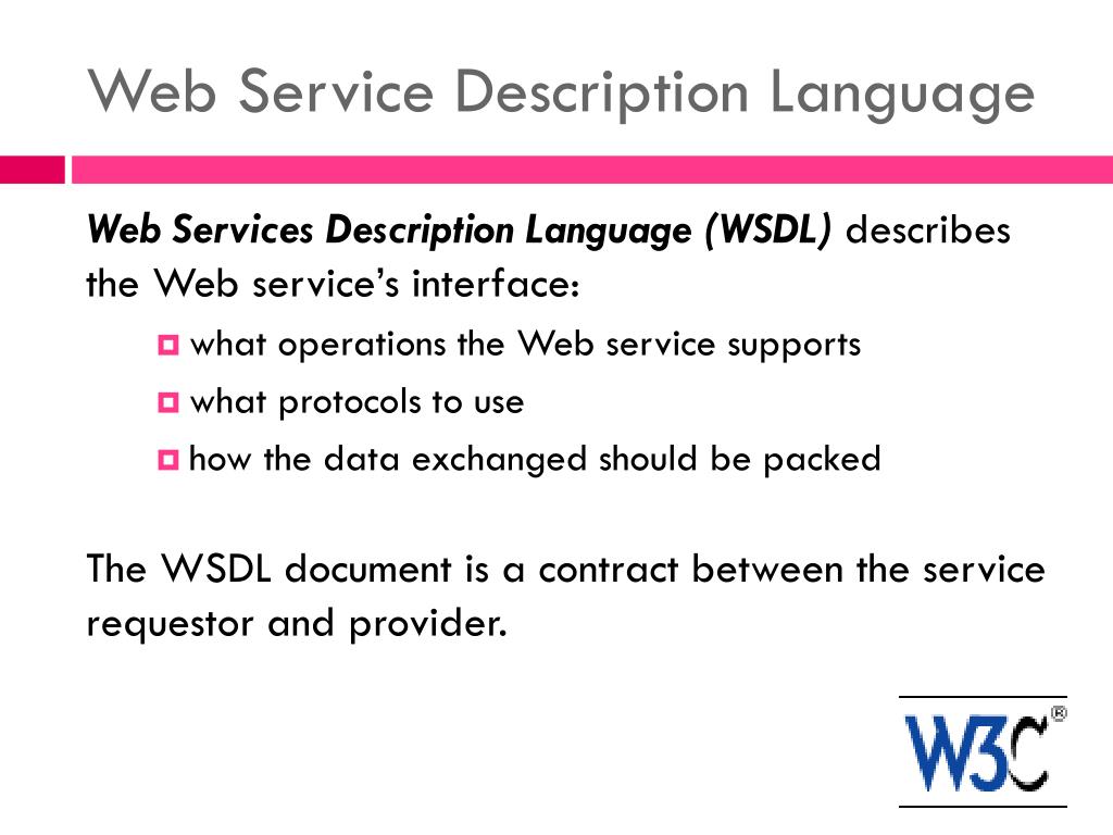 Web Service Description Language Web Services Description Language (WSDL) describes the Web service’s interface: • what operations the Web service supports • what protocols to use • how the data exchanged should be packed The WSDL document is a contract between the service requestor and provider.