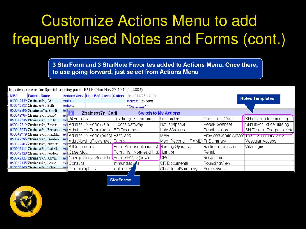 Customize Actions Menu to add frequently used Notes and Forms (cont.) 3 StarForm and 3 StarNote Favorites added to Actions Menu. Once there, to use going forward, just select from Actions Menu Notes Templates StarForms