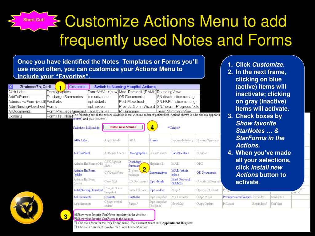 Short Cut! Customize Actions Menu to add frequently used Notes and Forms Once you have identified the Notes Templates or Forms you’ll use most often, you can customize your Actions Menu to include your “Favorites”. • Click Customize. • In the next frame, clicking on blue (active) items will inactivate; clicking on gray (inactive) items will activate. • Check boxes by Show favorite StarNotes … & StarForms in the Actions. • When you’ve made all your selections, click Install new Actions button to activate. 1 4 2 3