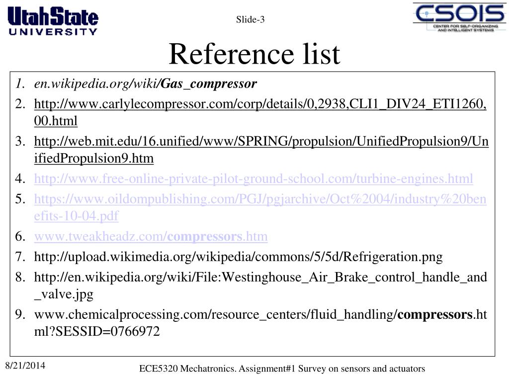 Outline • Reference list • Major applications • Compressor Principle • Compress Factor Temperature of Air • Compressibility Factor • Different Types • Way that Gas Can be Compress • Other Compressor • How to Compare Compressor • CompressorEfficiency • CompressorProblem • Where to buy ECE5320 Mechatronics. Assignment#1 Survey on sensors and actuators