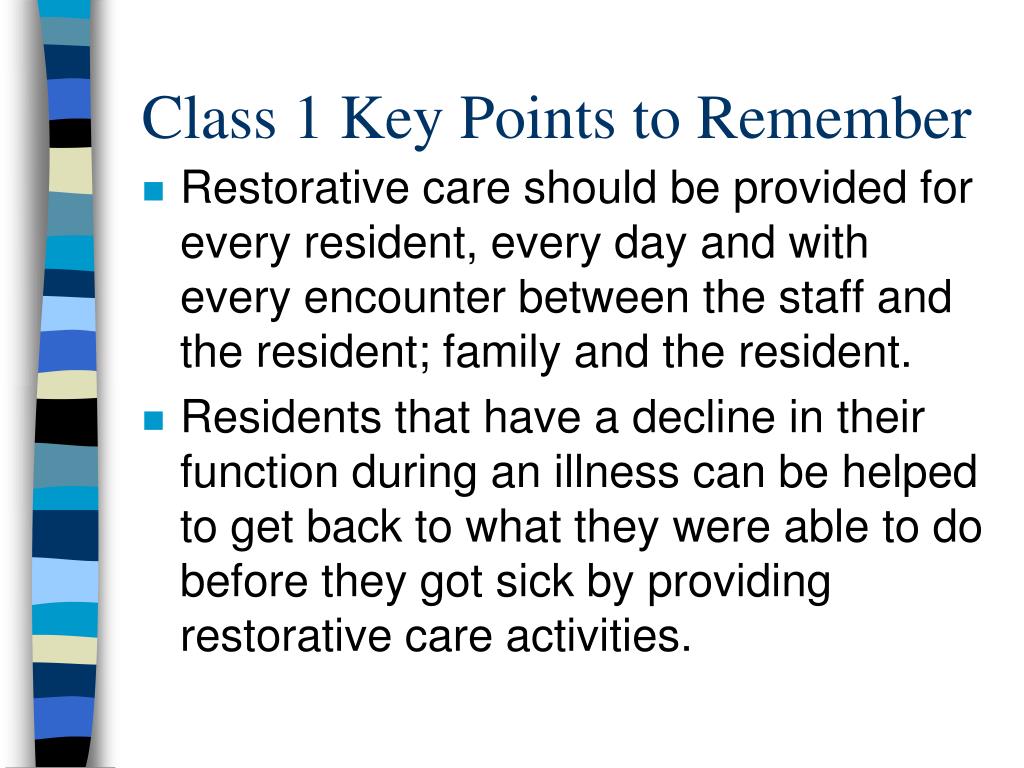 Class 1 Key Points to Remember • Restorative care should be provided for every resident, every day and with every encounter between the staff and the resident; family and the resident. • Residents that have a decline in their function during an illness can be helped to get back to what they were able to do before they got sick by providing restorative care activities.