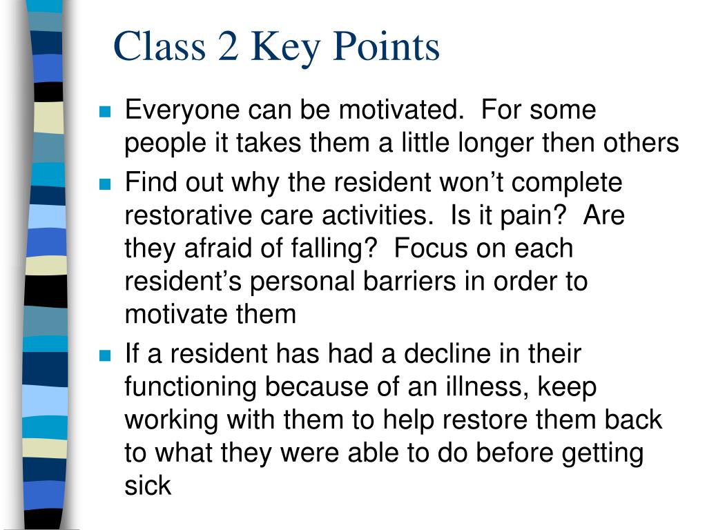Class 2 Key Points • Everyone can be motivated. For some people it takes them a little longer then others • Find out why the resident won’t complete restorative care activities. Is it pain? Are they afraid of falling? Focus on each resident’s personal barriers in order to motivate them • If a resident has had a decline in their functioning because of an illness, keep working with them to help restore them back to what they were able to do before getting sick
