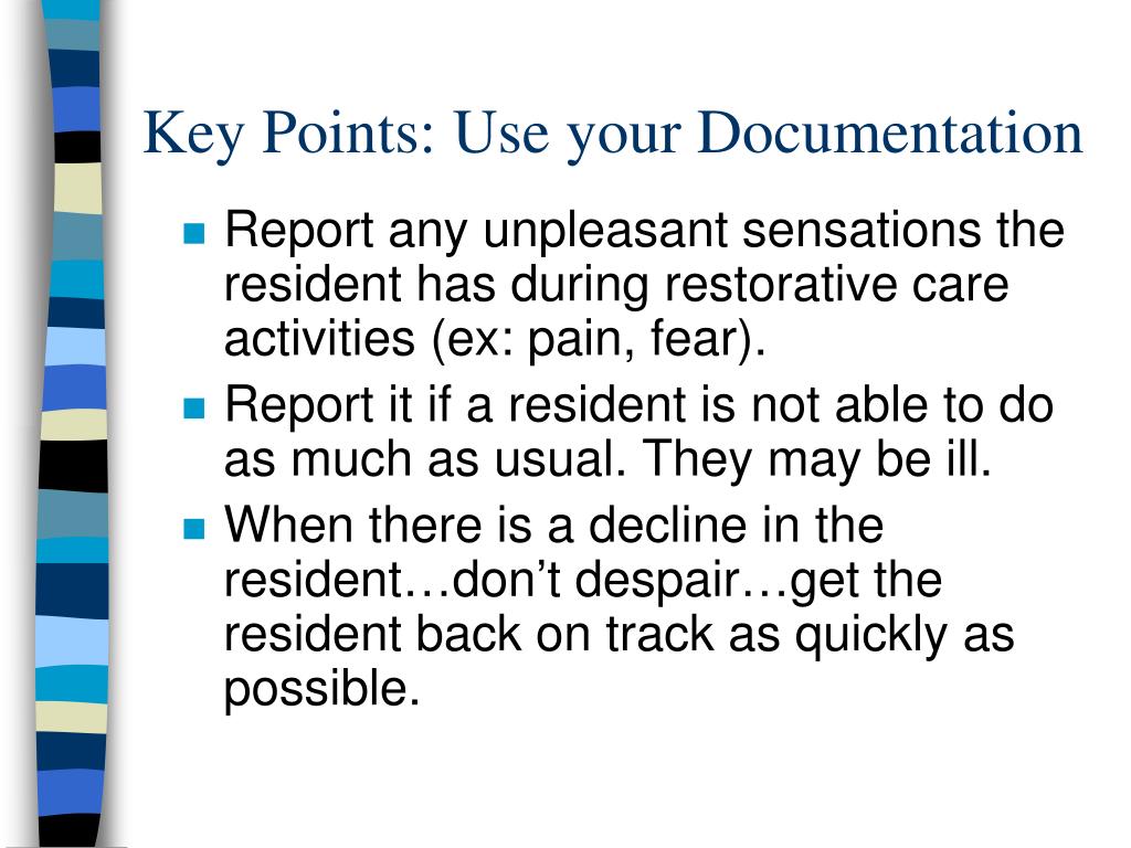 Key Points: Use your Documentation • Report any unpleasant sensations the resident has during restorative care activities (ex: pain, fear). • Report it if a resident is not able to do as much as usual. They may be ill. • When there is a decline in the resident…don’t despair…get the resident back on track as quickly as possible.