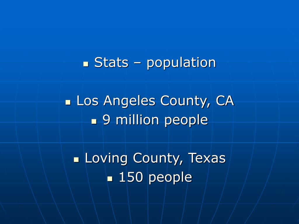 Stats – population • Los Angeles County, CA • 9 million people • Loving County, Texas • 150 people